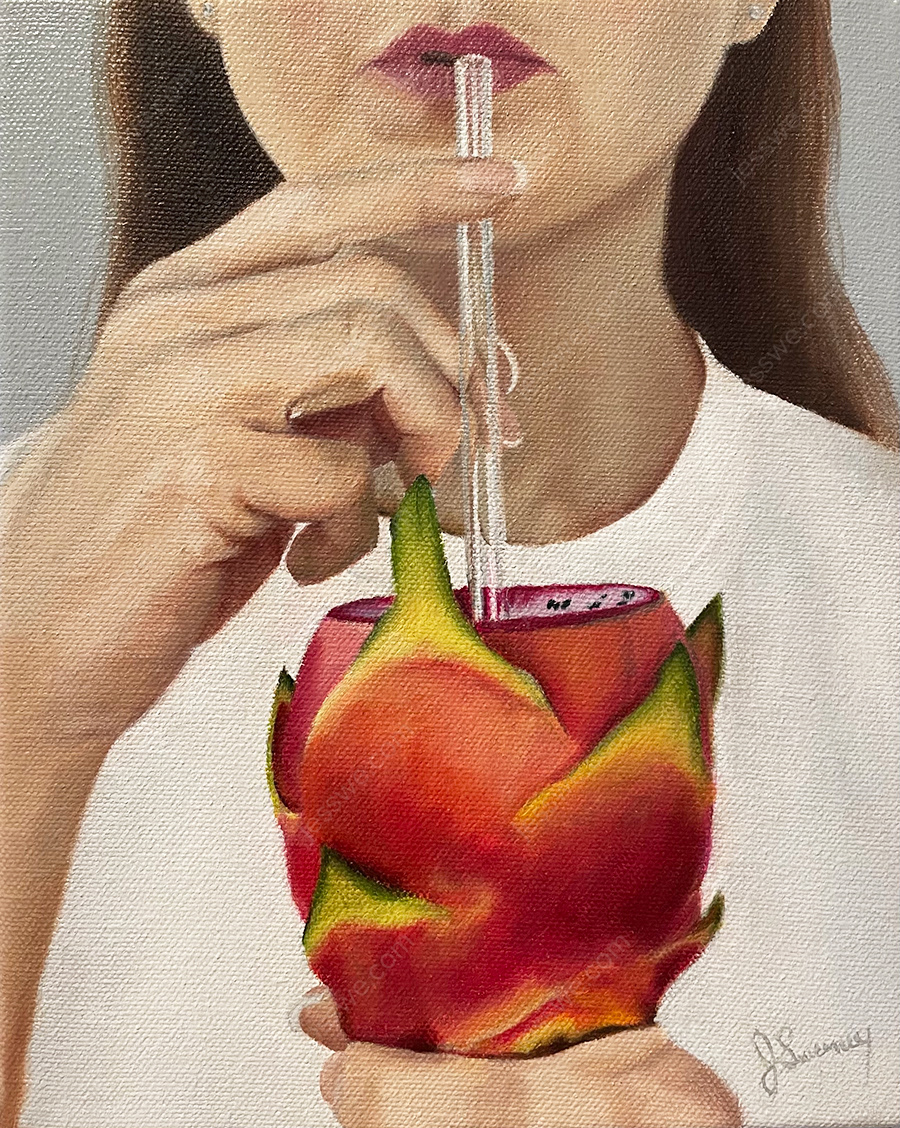 "Dragon Fruit", 8x10", Oil and acrylic on canvas, by Jessica Sweeney, 2024.