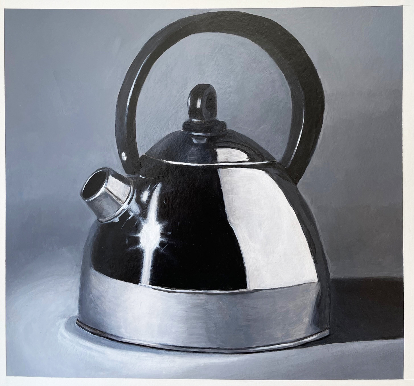 These are the finished works from an online acrylic painting class, using the teacher's reference image. Studying chrome and reflections on a tea kettle. 2021